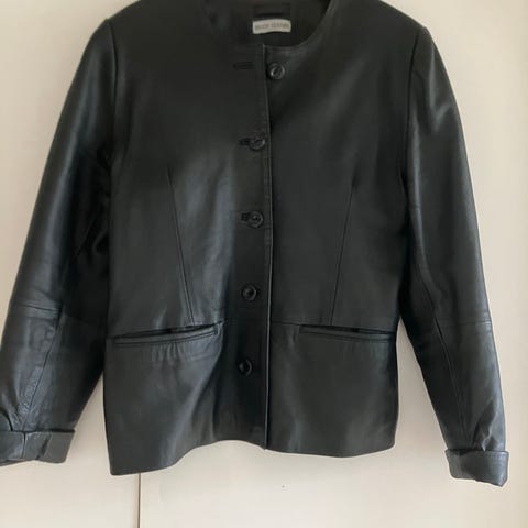 Sort 100% blød læderjakke mrk. CKN of Scandnavia str. XL med en krave. Lukkes med en kraftig lynlås. To stiklommer som også lukkes med lynlåse + en inderlomme. Foer i 100% polyester satin. Jakken er hel med patina