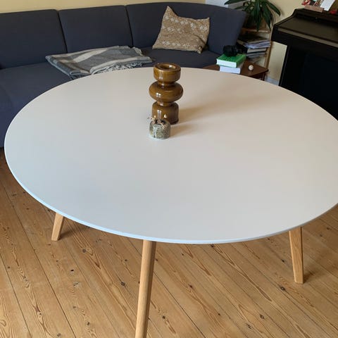 Rundt spisebord med træben og hvid laminat på bordpladen med diameter på 120 cm. Der er to enkelte mærker på bordpladen, hvor benene er forsøgt skruet for langt i, og så er der et par små hakker i kanten fra en flytning, men bordet står derudover i super pæn stand. Er skilt ad.