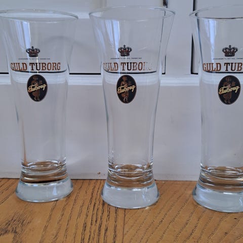 Tuborg ølglas på fod i klart glas. Glassene har Tuborg-logo med krone og grøn skrift på siden. Velegnet til servering af øl eller andre kolde drikke ved borddækning eller barbrug. Sælges som sæt, 5 stk.