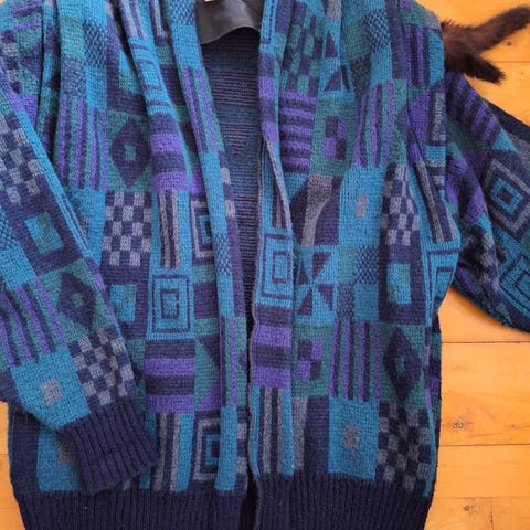 FCC cardigan med pels krave i størrelse L. Lavet i uld kashmir. Kraven og trøjen er rigtig fin stand, men der er et lille hul under højre armhule.