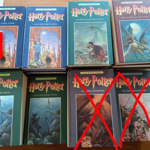 Den samlede Harry Potter serie med alle 7 bøger, den 7 i paperback men de 6 andre i hardback, 1-2-6-7 er i meget flot stand og de 3 andre er ja mere læst eller hvad man siger 😁 men mest af alt et pænt komplet set,