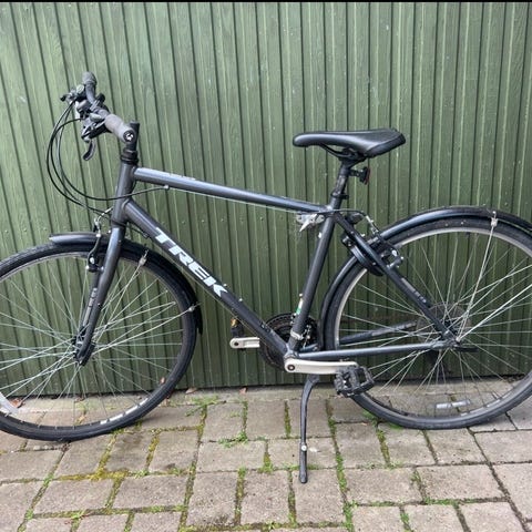 Trek hybridcykel til mænd med 55 cm stel og 28"/700c hjul. Cyklen har fladt styr og er egnet til både bykørsel og pendling. På billederne ses cyklen med skærme, sadel i sportssnit og standardpedaler. Hybridtypen kombinerer egenskaber fra city- og racercykler og giver en oprejst, men effektiv kørestilling, som passer til daglig transport og længere ture på asfalt og cykelstier.