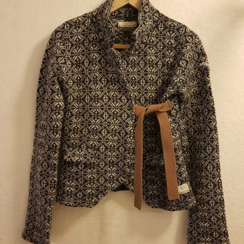 Odd Molly bomulds cardigan til kvinder i størrelse 1 (=S). Cardiganen er lyserød (se nr 2 billede). Den har rund hals, gennemgående knaplukning foran og bindebånd i taljen.