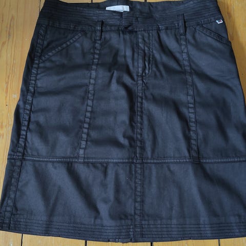 Nederdel mrk. FRN i str. 44 i sort med mønster i beige/grønne blade med to læg foran og to bagpå. Har sort foer i hele nederdelen. Lukkes med lynlås i venstre side. Længde ned i siden 59,5 cm. 98% bomuld 2 % spandex. Farven på nederdelen er som på det sidste billede. Hel, ren og pæn.