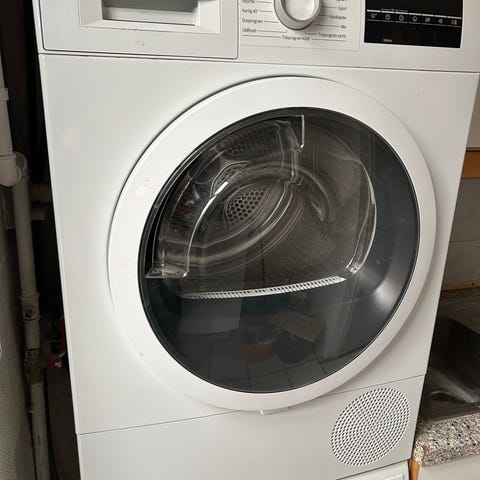 Bosch kondenstørretumbler i hvid. Modellen er en frontbetjent tørretumbler med kondens-teknologi og rund luge på fronten. Betjeningspanelet har drejeknap med flere tørreprogrammer samt display til indstillinger. Maskinen er egnet til indendørs placering, da fugten samles i en beholder i stedet for at blive ledt ud gennem aftræk. Velegnet til tørring af almindeligt tøj, håndklæder og sengetøj i husholdningen. Seks år gammel og virker som den skal.