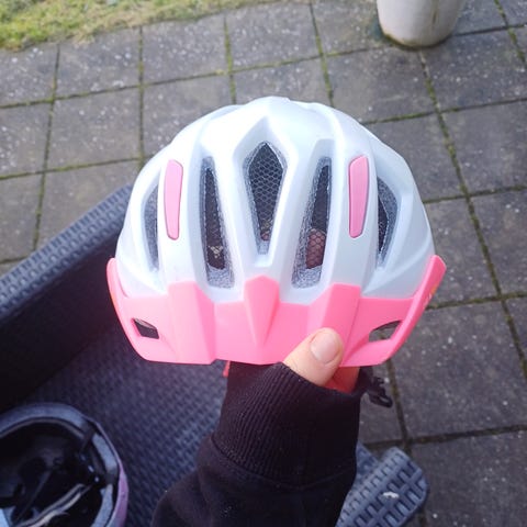 Cykelhjelm i pink farve med flere ventilationshuller og justerbare stropper. Hjelmen har hård yderskal og indvendig polstring for komfort. Egnet til cykling, løbehjul eller rulleskøjter afhængigt af størrelse og pasform.