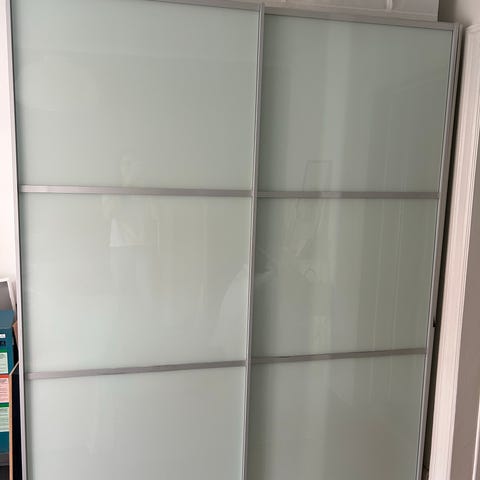 Garderobeskab med låger i matteret glas og rammer i trælook. Skabet er opbygget som et hjørnesystem med flere sektioner.