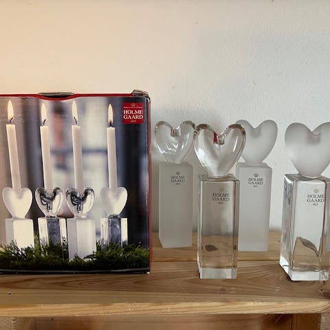 2 smukke hjerte glaslysestager fra Holmegaard (Anja Kjær) Den ene er i klart glas med mat, frostet hjerte, mens den anden er i frostet glas med klart, gennemsigtigt hjerte. Begge figurer har firkantet fod og Holmegaard-logo på forsiden.