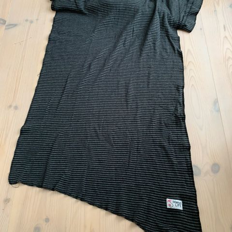Er i fast men helt tyndt stof, som gør den at vikle og binde. Får baby til at sidde helt tæt ind til dig. Særligt god mens de er helt små.