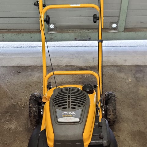 Alu skjold så ingen rust, bioklip, 48 cm klippebredde, b/s motor, service med nyt olie, kniv osv. Starter, kører og klipper fint. Samme kvalitet som en klippo