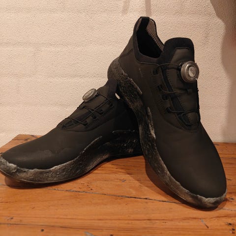 Ecco golfsko i sort læder i størrelse 40. Skoene har snørelukning og kontrastsyninger i hvid samt små røde detaljer på siden. Ydersålen er rød med udskiftelige softspikes, der giver godt greb på golfbanen. Velegnet som golfsko til brug på banen for personer, der bruger skostørrelse 40.