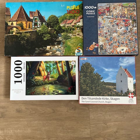Blandet parti puslespil med 1000 brikker pr. puslespil. Motiverne omfatter forskellige landskaber, herunder bjerge, søer, haver og byudsigt. Velegnet til puslespilsentusiaster, der ønsker natur- og bymotiver i samme samling. Pris pr stk 20kr