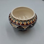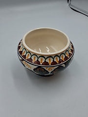 Skålen har en hexagonal form med blå kant og dekorationer. Den er lavet af keramik.,Bemærk at mail, chat og beskeder ikke besvares, og varen skal købes på knappen "Gå til varen"
