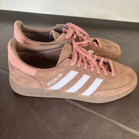 Adidas Spezial sneakers i str. 39. Modellen er i sort med hvide striber og brun gummisål. Overdel i ruskind og tekstil med snørelukning. Klassisk lav sneakers, velegnet til hverdagsbrug og fritid.