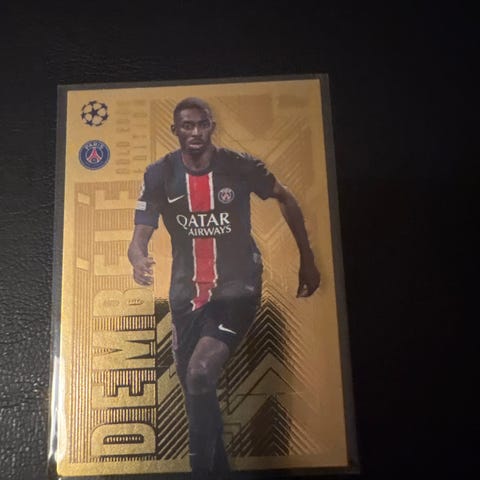 Topps Ousmane Dembélé fodboldkort med motiv af spilleren i Paris Saint-Germain (PSG) kamptrøje. Kortet viser spilleroplysninger på bagsiden, herunder position som angriber, trøjenummer 10 og klubdebut for sæsonen 2023/24. Egnet til samling af fodboldkort og som del af PSG- eller Ousmane Dembélé-samlinger.