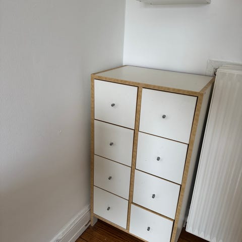 Hvid Tvilum kommode med 3 store skuffer (heraf kan den øverste låses), 4 hjul og det hele fungerer som det skal. Mindre brugsmærker (se billeder) men ellers i rigtig god stand