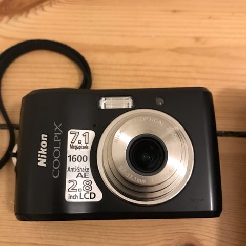 Nikon digitalkamera i sort med aftageligt objektivdæksel. Kameraet sælges sammen med en polstret kamerataske i sort/grå med skulderrem og indvendig opdeling til kamera og tilbehør.
