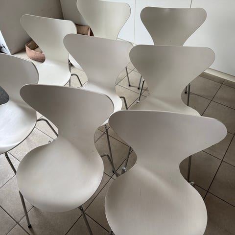 Fritz Hansen stol designet af Arne Jacobsen. Stolen har hvidt sæde og ryg i formspændt skal. Modellen er stabelbar og egner sig til brug ved spisebord, skrivebord eller som ekstra stol i bolig eller kontor.