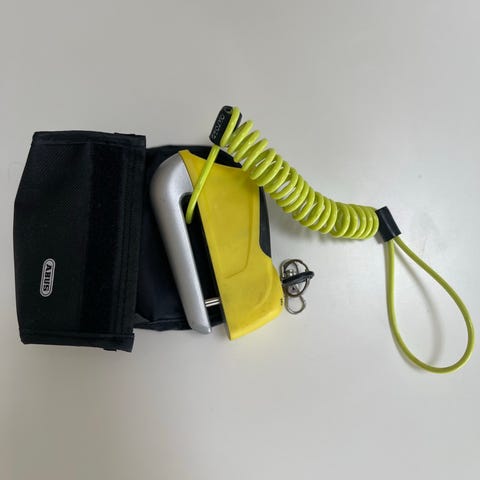 Ubrugt men åbnet Oxford alpha xa14 skivelås i gul farve. Låsen er beregnet til montering på bremseskiven på en motorcykel. Den sælges med nøgle og sikkerhedssnor.