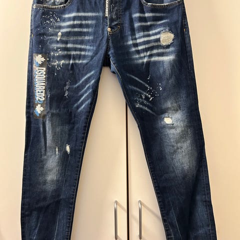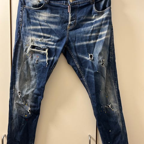 Dsquared2 jeansslim fit i str. 54. Bukserne er fremstillet i grå denim med slidt og distressed look, herunder mindre huller og afsatte pletter som en del af designet. Klassisk 5-lommemodel med bæltestropper og lynlås- og knaplukning. Velegnet som hverdagsbukser i et casual outfit.