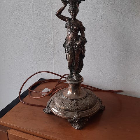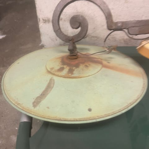 B) Den anden på 160cm med 3 bronzestandere og de originale gule glasskærme uden afslag eller revner.