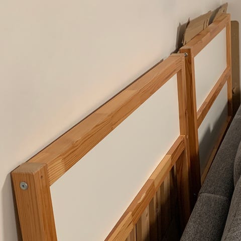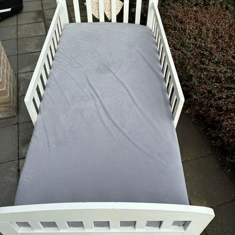 Egentlig fin børneseng. Alder 3-8 år. Lamel er knækket - har været løst fint med et stykke pap. Har en del brugsspor, men det kan friskes op 🙂