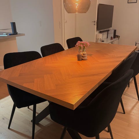 Flot spisebord i ægte træ med elegant sildebensmønster og sorte krydsben - Fejler absolut intet.