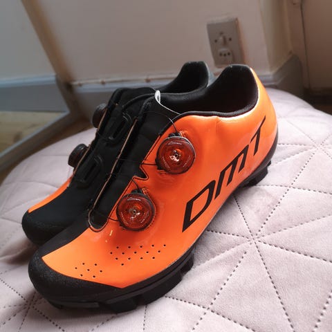 FLR cykelsko i størrelse 41. Skoene er sorte med gule detaljer og indvendig polstring. De har tre lukkestropper, heraf én med spænde, for justerbar pasform. Undersålen er udstyret med gule grebsfelter og beslag til klamper, egnet til klikpedaler. Velegnet som cykelsko til mountainbike og Gravel. Kun brugt meget få gange.
