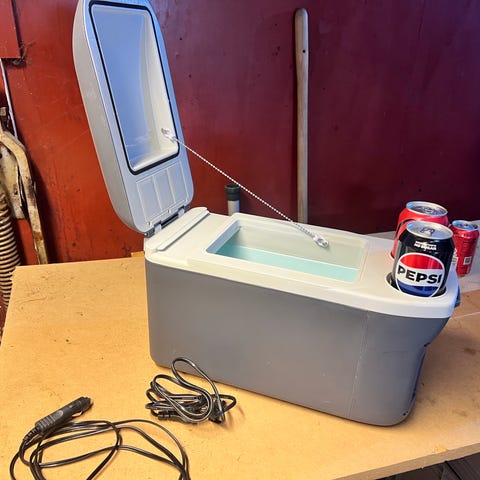 Grå bærbar køler, ideel til at holde dine drikkevarer og mad friske. - Kompakt og funktionelt design. - To kopholdere integreret i låget. - Kontrolpanel med temperaturjustering.