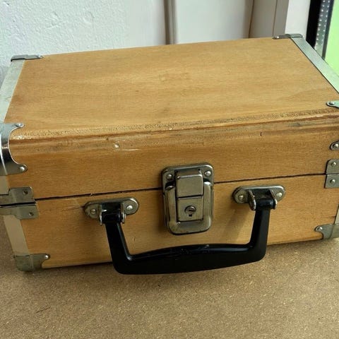 Super sjov kuffert med ca 50 stk forskellige brocher, hår kamme, pynt til kjoler, jakker mm. Kufferten måler 91 x 27 x 6,5 cm.