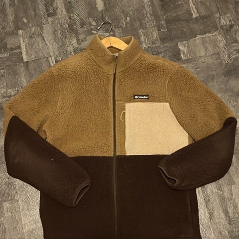 Columbia jakke til herre i størrelse L. Jakken er blå med sorte paneler for og bag på bryst og skuldre. Materialet er primært polyester med vatterede felter foran og bagpå samt blødere stof på ærmer og nederste del. Lynlås foran hele vejen ned. Velegnet som yderjakke i mildt vejr eller som mellemlag under en skaljakke.