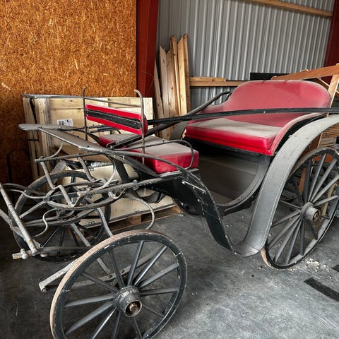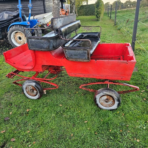 Hestevogn af Emanuel Nielsen i træ med fire hjul og rødt polstret sæde. Vognen har trækonstruktion med metalbeslag og egerhjul i træ, gummi på hjul. Der medfølger stænger til forspænding, som ses på billederne. Egnet som hestevogn til kørsel eller som dekorativ vogn til brug på gård eller i landlige omgivelser.