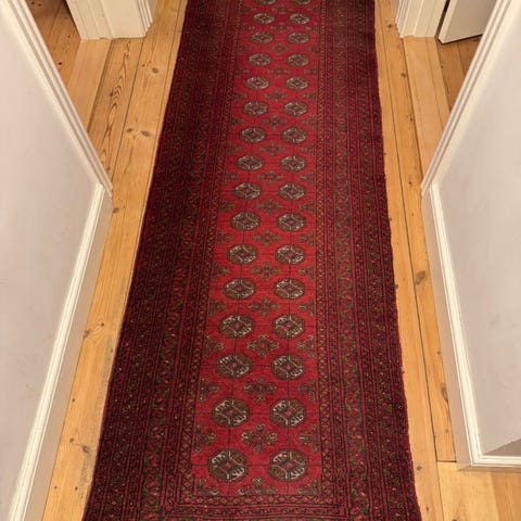 Smuk håndknyttet uldløber i klassisk Bokhara-mønster.