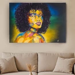 De stærke farvekontraster og det intense blik skaber en følelse af både ro og styrke, et værk der bringer liv og personlighed ind i ethvert rum.
