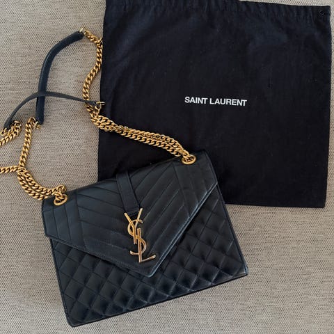 En elegant og klassisk skuldertaske fra Saint Laurent. Sunset-modellen er en af husets mest populære designs og kendetegnes ved det ikoniske YSL-logo på fronten og den smukke kæderem i guldfarvet metal. Tasken er lavet i glat læder i en smuk mørkegrøn nuance, som giver et sofistikeret og lidt mere afdæmpet alternativ til klassisk sort. Den lukkes med magnet under klappen og har en praktisk opdeling indvendigt, så de vigtigste ting kan organiseres nemt. Kæderemmen kan bæres både over skulderen eller crossbody, hvilket gør modellen både elegant og anvendelig til hverdag såvel som til aftenbrug. Sunset-modellen blev introduceret under Hedi Slimane og er inspireret af klassiske franske skuldertasker fra 1970’erne, men med Saint Laurents mere moderne og minimalistiske udtryk.