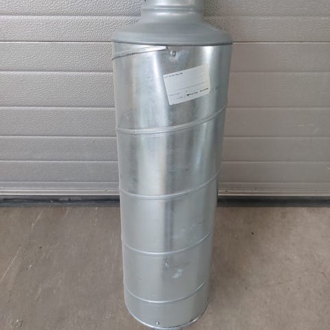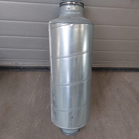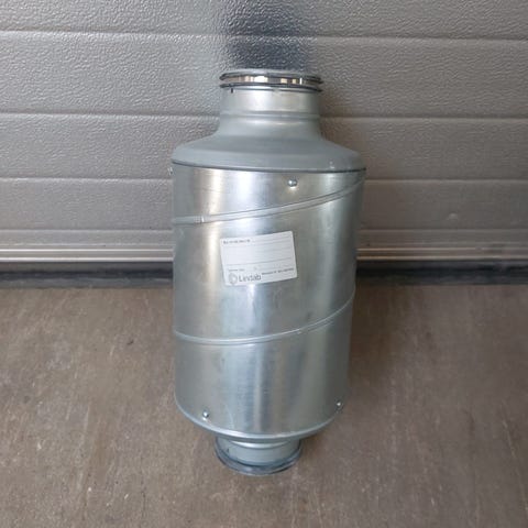 Lindab lyddæmper SLU 160 600 Galv 50. Varen er i rigtig god stand. Dimension L:60 X Ø16cm Mål: 600x160x160mm.