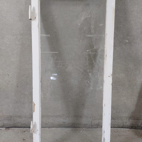 Vinduesfag med kittet rude 57,5x123cm med anverfere, stormkrog og den ene del af et hængsel. Vindues faget er højre hængslet. Den er med en 1-lags kittet rude, hvor kittet er tørt og begyndt at smuldre af. Malingen er også begyndt at smuldre af, men træet er forholdsvis sømfast. Dimension B:57,5 X H:123 X D:4,5cm