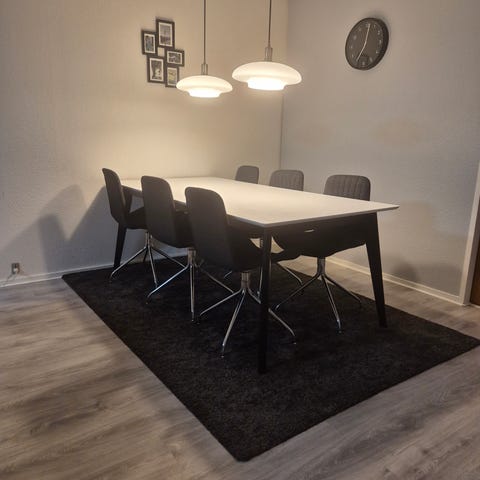 Spisebordet er i kunstfiner med egetræslook og matchende ben. Inkluderer 6 gode stole, der blev købt sammen med bordet.