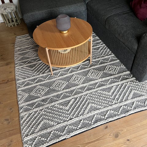 Ellos tæppe i lys, neutral nuance med vævet mønster og blød, høj luv. Tæppet har et diskret, geometrisk inspireret design, som egner sig til stue, soveværelse eller andre opholdsrum. Passer godt under sofabord eller som større gulvtæppe i rummet.