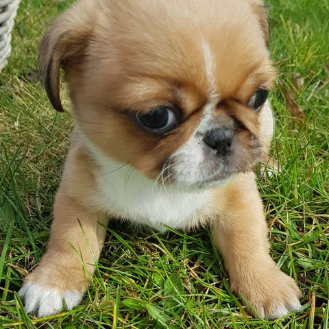 Faren er ren mops og mor er maltesere blanding . Han kan flytte hjemmefra d 30/4.