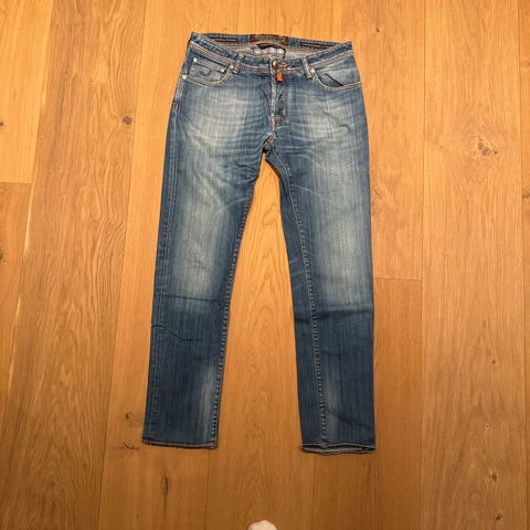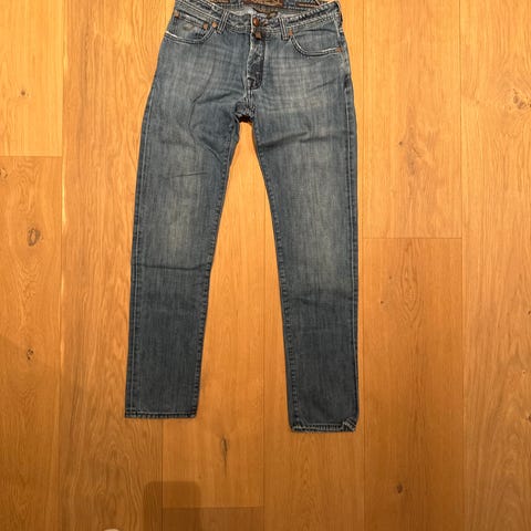Jacob Cohën jeans til herrer i blå denim. Bukserne er fremstillet i denim og har taljemål W32 og angivet størrelse XL. Klassisk femlommers-model med lynlås og knaplukning. Velegnet som hverdagsbukser eller til mere afslappede anledninger.