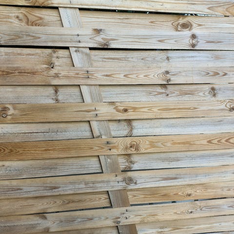 Træhegn i lamelmodel i grå farve. Hegnet består af lodrette stolper og vandrette lameller med mindre mellemrum, som giver afskærmning og læ. Velegnet som afskærmning i have, på terrasse eller langs skel. Konstruktionen er i træ og fremstår malet i grå nuance.