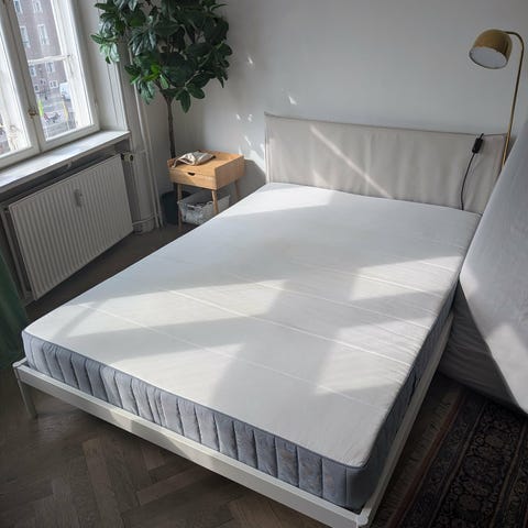 High quality matress from IKEA, used for a year and a half with a matress cover. There is a slight discoloration where chamomile tea spilled and soaked through the mattress cover. Otherwise it’s in very good condition and was kept very clean.