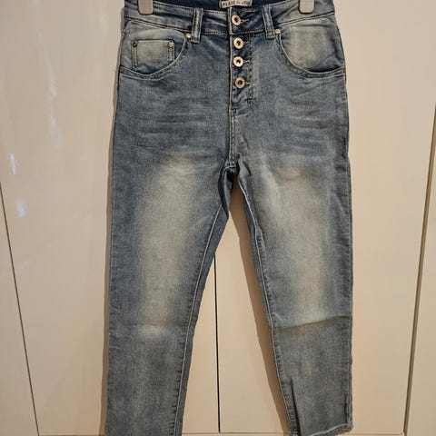 3. Imitz. brune. Der står str. 34 men de svarer til str. 36. Der mangler en knap på en lomme, som er let at skifte.