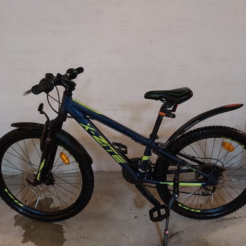 En fin og velholdt blå Pinepeak mountainbike, model "Lion". 24 tommer hjul, 34cm stel, 21 udvendige gear, gearskifte håndtag, fjedret forgaffel, støtteben og reflekser både for og bag.