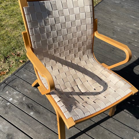 Flot lavrygget lænestol med stel af formbøjet bøgetræ, beviklet med flettet kanvasgjorde. Fremstillet hos Japo Collection?