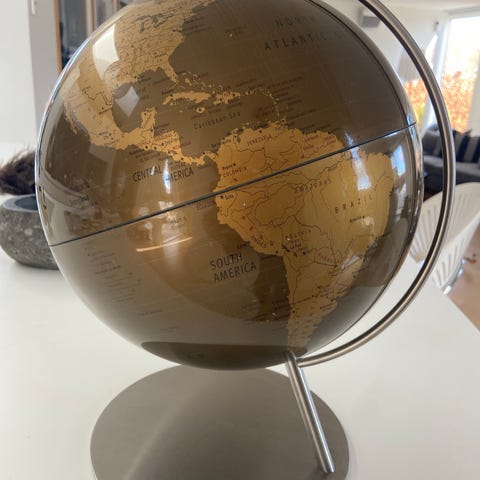 Dekorativ globus på marmorfod i hvid og sølv. Globussen står på en firkantet fod i lys marmor og har metalakser og beslag i sølvfarve. Velegnet på reol, skrivebord eller hylde i stue, kontor eller værelse.