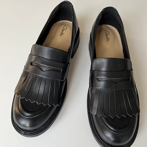 Clarks loafers i størrelse 40. Skoene har overdel med leopardmønster kombineret med sorte detaljer og sorte snørebånd. Ydersålen er i sort gummi med Clarks-logo. Velegnet som hverdagssko eller fritidssko.