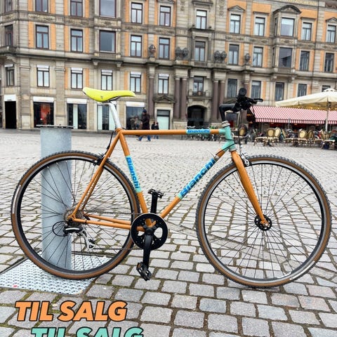 Nishiki gravel bike i flot rødlilla/brun farve. Jeg har selv kørt med city dæk i den tid jeg har haft den og været meget glad for den. Jeg har dog skiftet dækkene til racerdæk, men ikke brugt den siden, da jeg fik en ny bycykel.