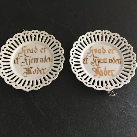 Vintage Petticoat and Pantaloons platter. Rund porcelænstallerken med motiv fra 1973 med titlen "Love is the little things we do for each other". Tallerkenen har guldfarvet ring mellem kant og midte. På bagsiden er der påmonteret tallerkenophæng til ophæng på væg. Velegnet som dekoration eller samlerobjekt. Se billeder for mål. Skal afhentes efter aftale.